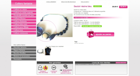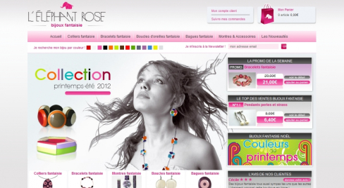 L'Éléphant Rose est un site de vente en ligne de bijoux fantaisie. Les bijoux sont classés par catégories mais aussi par couleurs pour optimiser le référencement et l'ergonomie. Les soldes et promotions sont fréquentes, et les prix tout petits !